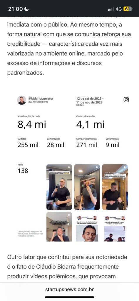 Com sua postura inovadora e sua disposição em abordar temas que nem sempre agradam a todos, Cláudio Bidarra personifica o novo perfil de corretor que compreende as dinâmicas da era digital — um profissional que não apenas vende imóveis, mas também constrói narrativas, provoca reflexões, desperta emoções e transforma o modo como o público enxerga o universo da corretagem. Sua trajetória recente comprova que, na era dos vídeos curtos, quem domina a comunicação, domina o mercado.